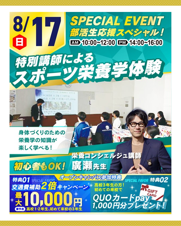 日本栄養コンシェルジュ協会 管理栄養士の廣瀬直樹が広島リゾート&スポーツ専門学校にて行われるオープンキャンパスにて講演します!