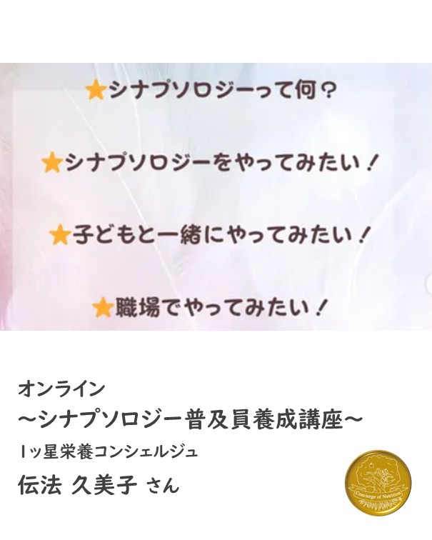 1ッ星栄養コンシェルジュでインストラクターの伝法久美子さんが9月12日(金)にオンラインにて行われる、『シナプソロジー普及員養成講座』にて講師を務められます☆