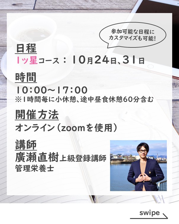 【1ッ星コースコース】第1日目: 10月24日(金)、第2日目: 10月31日(金)