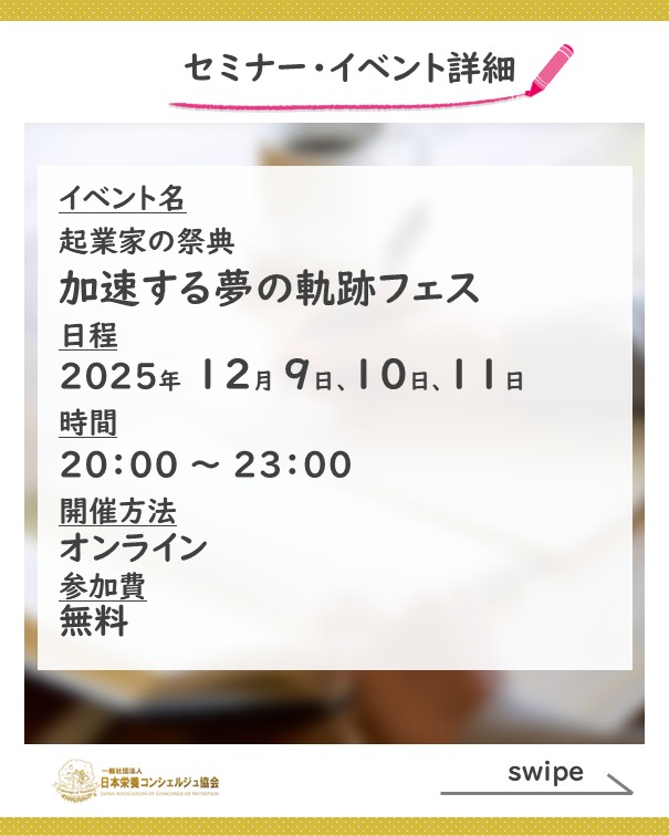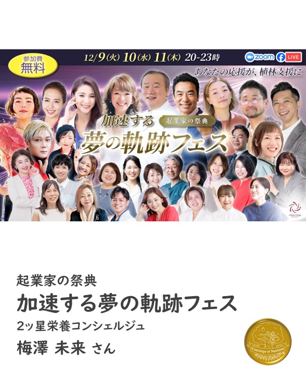 2ッ星栄養コンシェルジュで女性の社会自立・活躍専門家の梅澤未来さんが12月9日(火)、10日(水)、11日(木)にオンラインにて開催される起業家の祭典、『加速する夢の軌跡フェス』に登壇されます☆