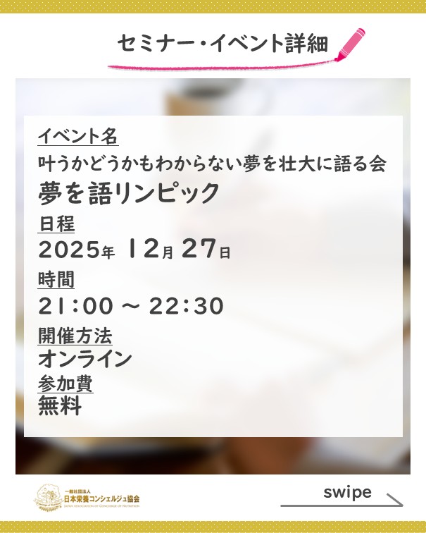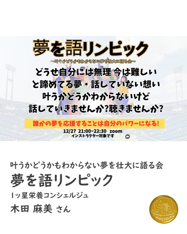 1ッ星栄養コンシェルジュでインストラクターの木田麻美さんが12月27日(土)にオンラインにて、『夢を語リンピック』を開催されます☆