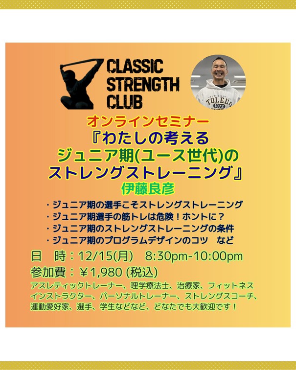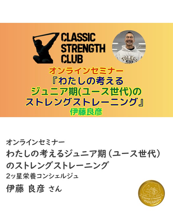 2ッ星栄養コンシェルジュでストレングスコーチの伊藤良彦さんが12月15日(月)にオンラインセミナー、『わたしの考えるジュニア期(ユース世代)のストレングストレーニング』にて講師を務められます☆