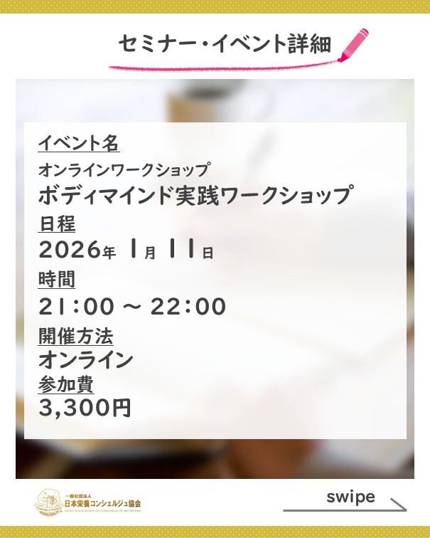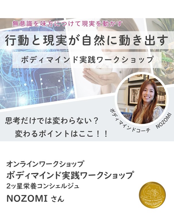 2ッ星栄養コンシェルジュでボディマインドコーチでもあるのぞみさんが1月11日(日)にオンラインにてボディマインド実践ワークショップ、『行動と現実が自然に動き出す』にて講師を務められます☆