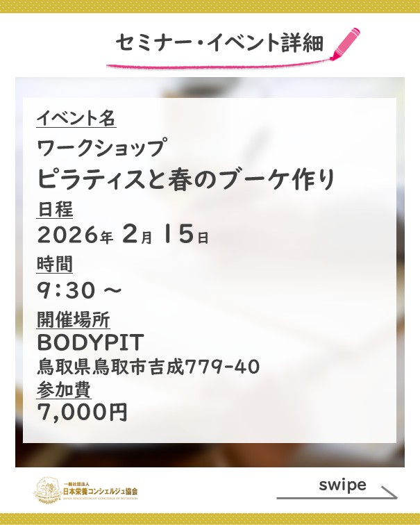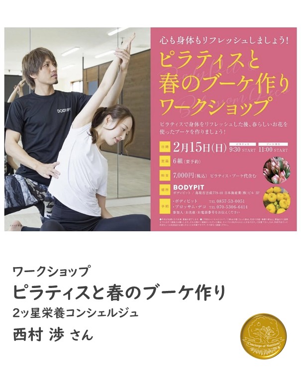2ッ星栄養コンシェルジュでピラティスインストラクターの西村渉さんが2月15日(日)に鳥取にてワークショップ、『ピラティスと春のブーケ作り』を開催されます☆