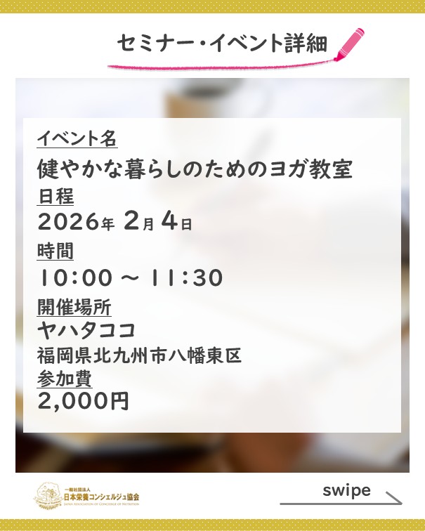 2ッ星栄養コンシェルジュでヨガ講師の島添美樹さんが2月4日(水)、2月20日(金)に福岡にて開催される、『健やかな暮らしのためのヨガ教室』にて講師を務められます☆