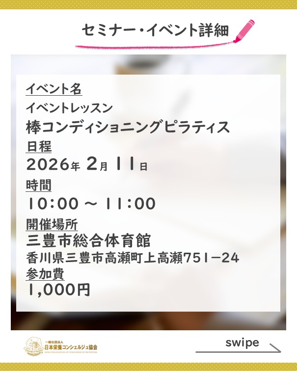 2ッ星栄養コンシェルジュで健康運動指導士・ピラティスインストラクターの矢野ゆかりさんが2月11日(水祝)に香川にて開催される、『棒コンディショニングピラティス』にて講師を務められます☆