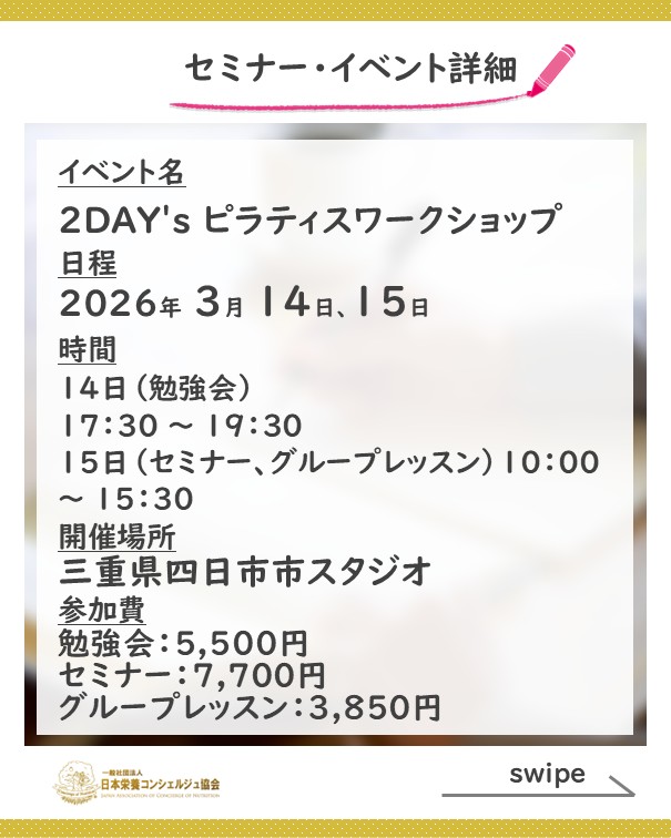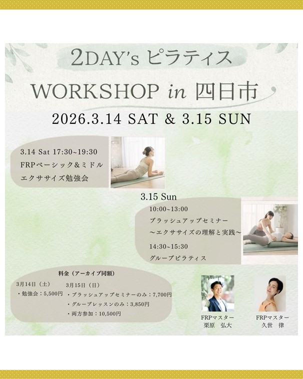 2ッ星栄養コンシェルジュでFRピラティスマスタートレーナー・健康運動指導士の栗原弘大さんが3月14日(土)、15日(日)に三重にて、『2DAY's ピラティスワークショップ』を開催されます☆