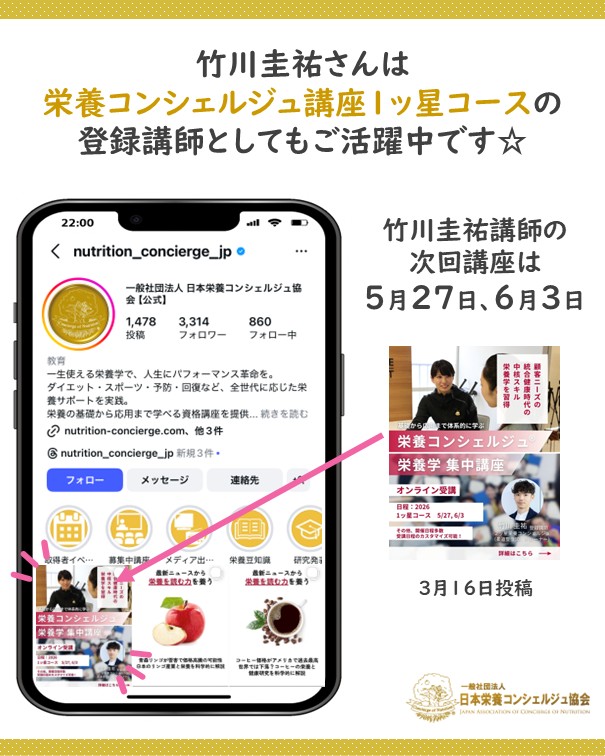 全世代&ステージに応じた栄養サポートでライフパフォーマンスを高める栄養資格、栄養コンシェルジュを取得した竹川さんのご活動が健康投資をサポートして、人と未来を輝かせます☆