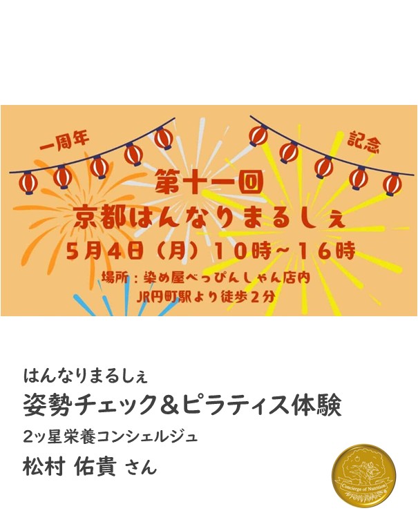 2ッ星栄養コンシェルジュで理学療法士・公認心理師の松村佑貴さんが5月4日(月祝)に京都にて開催される、『はんなりまるしぇ』にて姿勢チェック&ピラティス体験のブース出店をされます☆