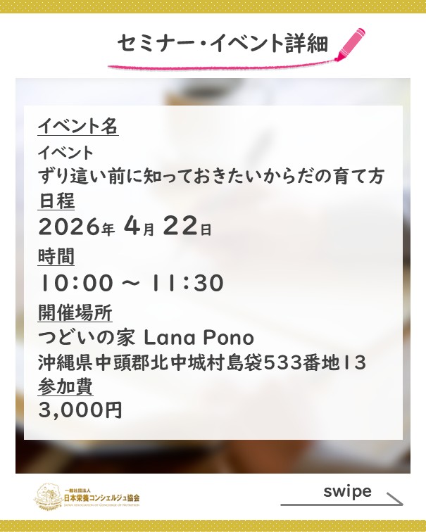 2ッ星栄養コンシェルジュで理学療法士の金城せいかさんが4月22日(水)に沖縄にて開催されるイベント、『ずり這い前に知っておきたい♡からだの育て方』にて講師を務められます☆