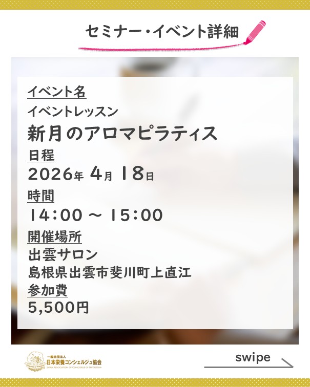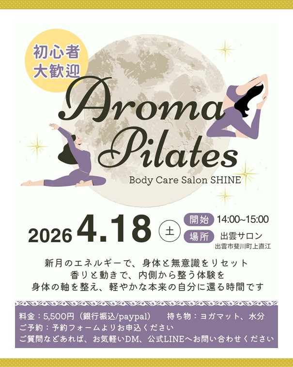 2ッ星栄養コンシェルジュでボディマインドコーチでもあるのぞみさんが4月18日(土)に島根にてイベントレッスン、『新月のアロマピラティス』を開催されます☆