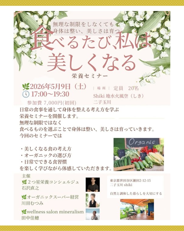 2ッ星栄養コンシェルジュでライフスキルコーチの石沢直之さんが5月9日(土)に東京にて開催される栄養セミナー、『食べるたび、私は美しくなる』にて講師を務められます☆