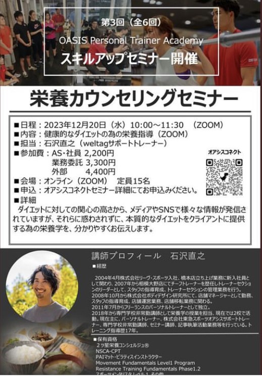 2ッ星栄養コンシェルジュでライフスキルコーチの石沢直之さんが12月20日(水)に栄養カウンセリングセミナーにて講師を務められます☆