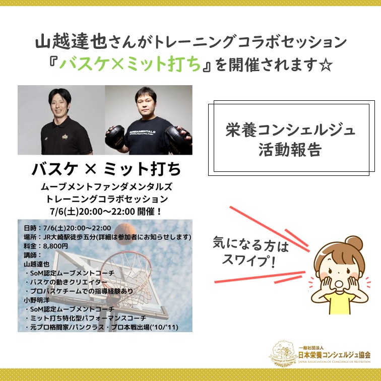 2ッ星栄養コンシェルジュでストレングス&コンディショニングコーチの山越達也さんが7月6日(土)にトレーニングコラボセッション、『バスケ×ミット打ち』を開催されます☆