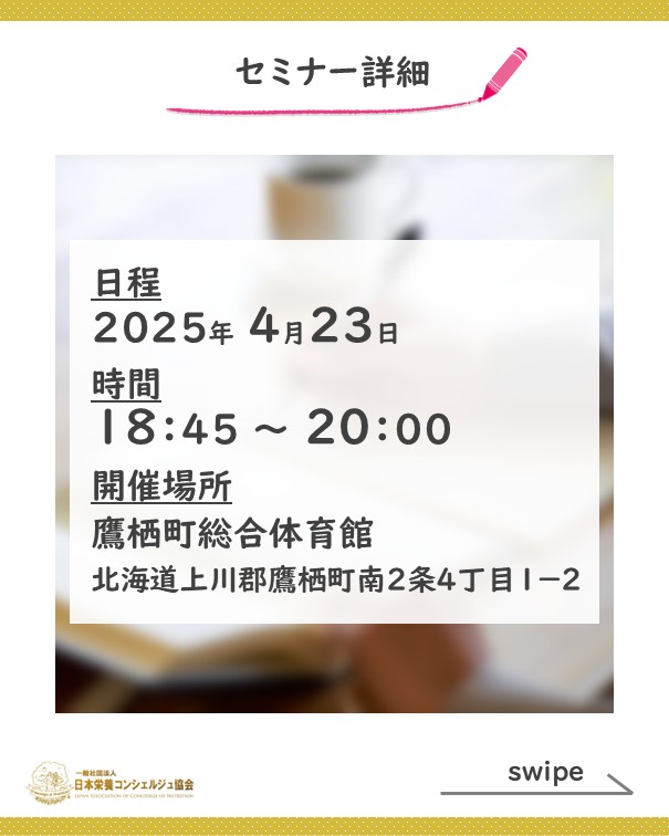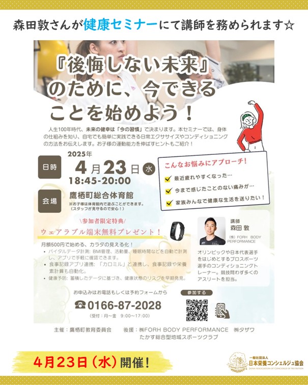2ッ星栄養コンシェルジュでパーソナルトレーナーの森田敦さんが4月23日(水)に北海道にて開催される健康セミナー、【『後悔しない未来』のために、今できることを始めよう!】にて講師を務められます☆