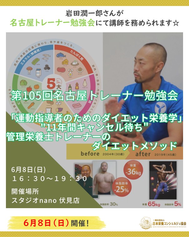 2ッ星栄養コンシェルジュで管理栄養士・トレーナーの岩田潤一郎さんが6月8日(日)に名古屋トレーナー勉強会、『運動指導者のためのダイエット栄養学』にて講師を務められます☆