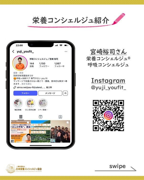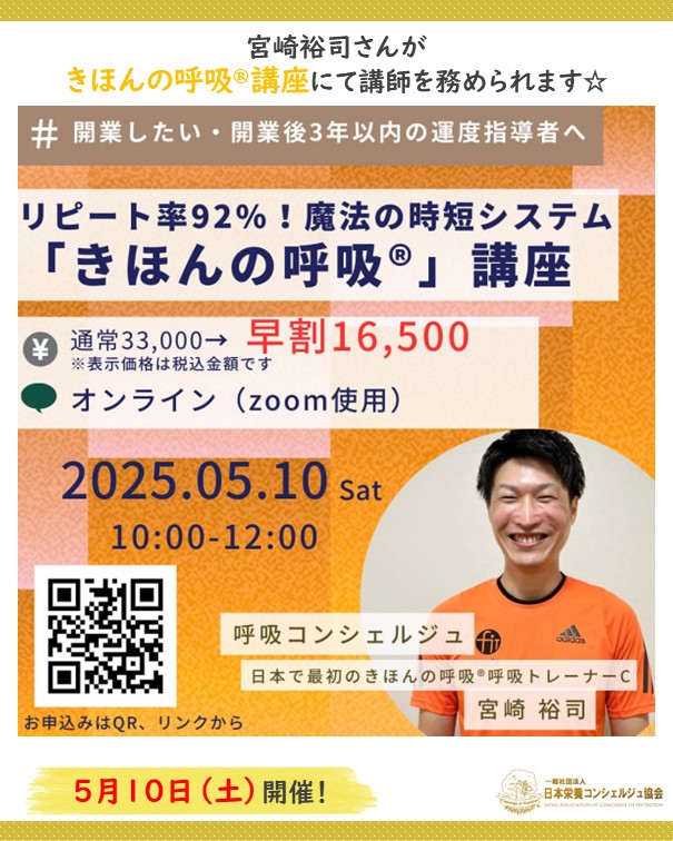 2ッ星栄養コンシェルジュで呼吸コンシェルジュの宮崎裕司さんが5月10日(土)にオンラインにて行われる、きほんの呼吸®︎講座にて講師を務められます☆
