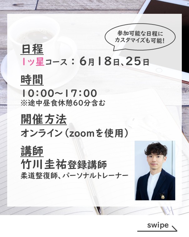 日程をカスタマイズして、実地やオンラインを組み合わせて受講することも可能です☆(お申し込み後の変更もOK)