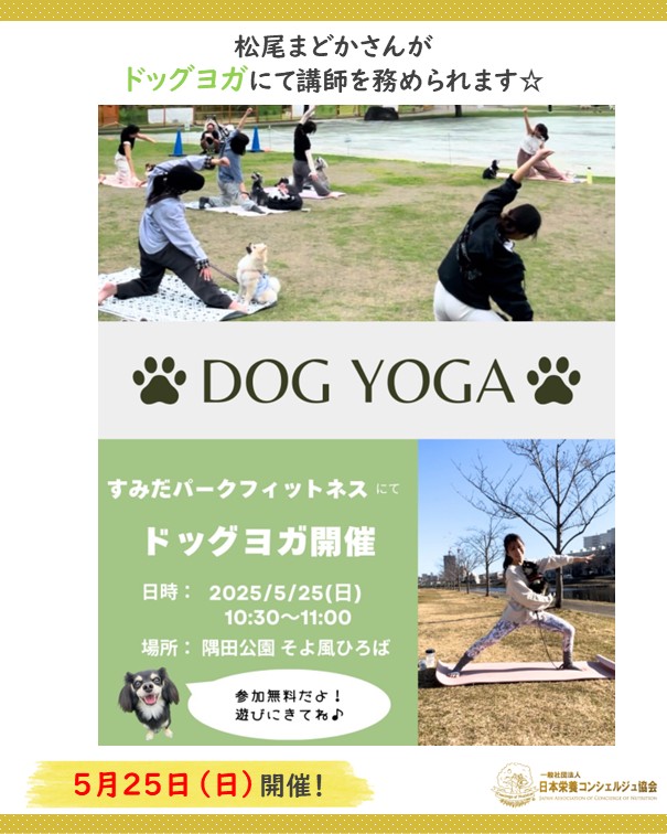 2ッ星栄養コンシェルジュでヨガ講師・食事管理コーチの松尾まどかさんが5月25日(日)に東京にて開催される、すみだパークフィットネスにてドッグヨガの講師を務められます☆