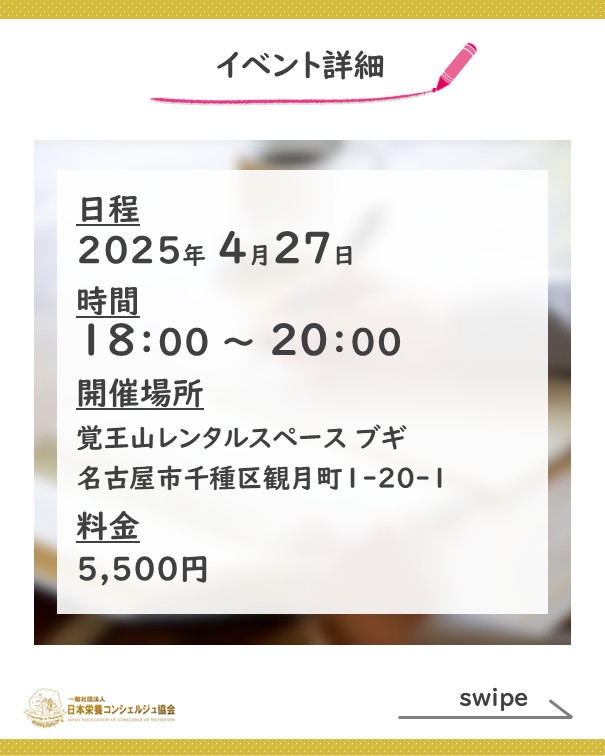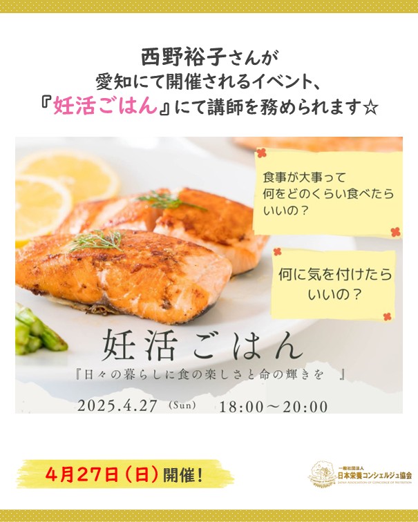 2ッ星栄養コンシェルジュで助産師の西野裕子さんが4月27日(日)に愛知にて開催されるイベント、『妊活ごはん』にて講師を務められます☆