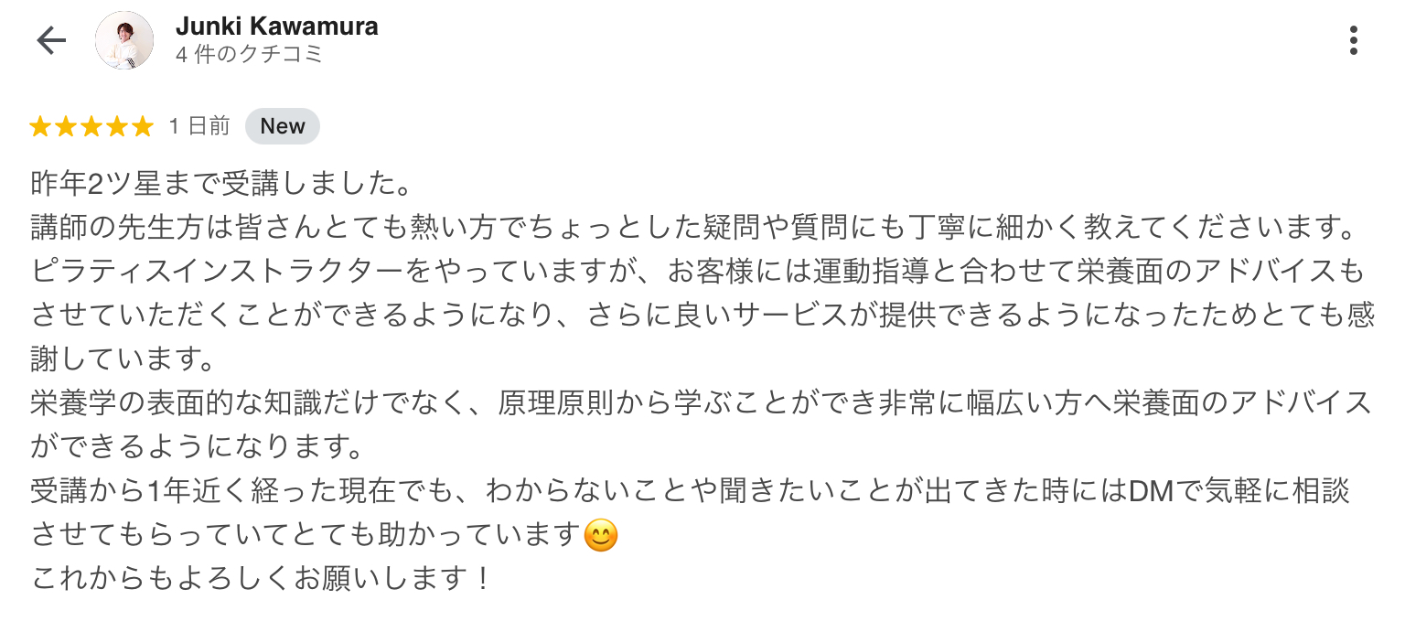 ピラティスインストラクターをやっていますが、お客様には運動指導と合わせて栄養面のアドバイスもさせていただくことができるようになり、さらに良いサービスが提供できるようになったためとても感謝しています。