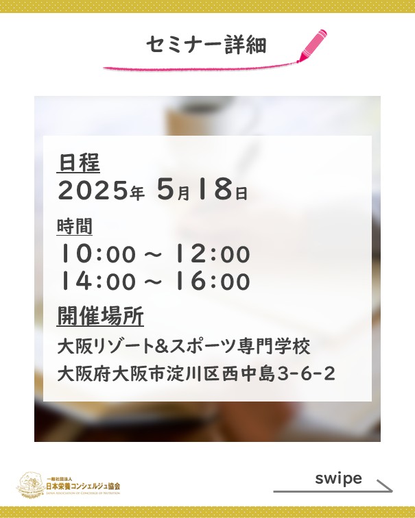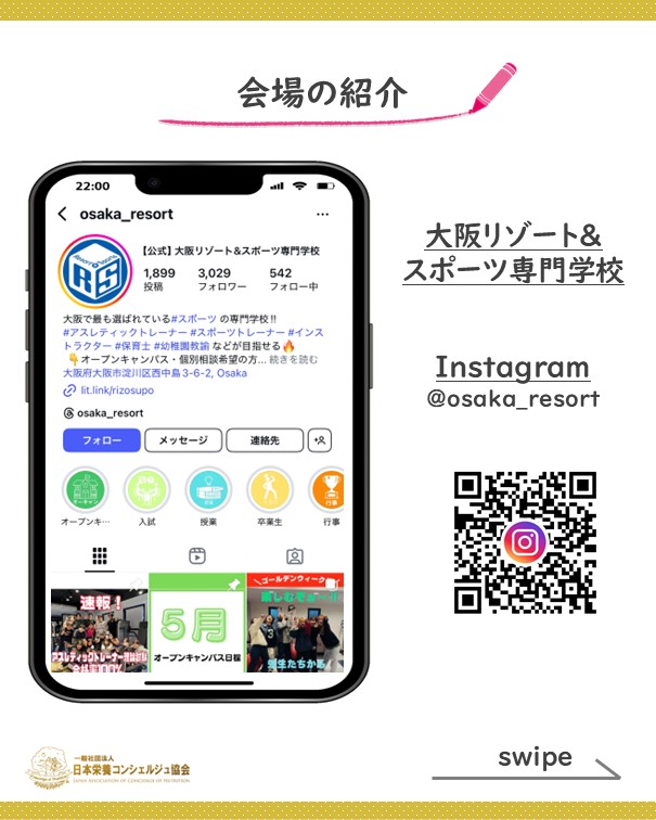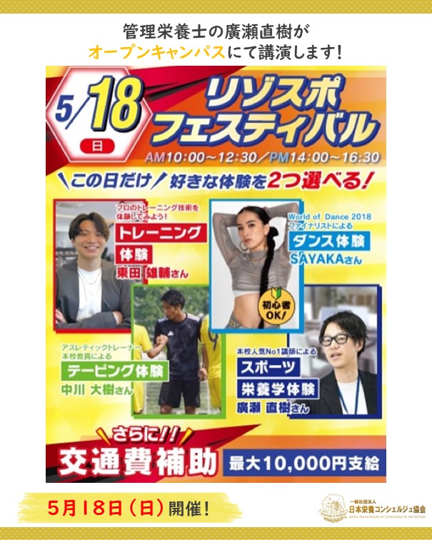 日本栄養コンシェルジュ協会 管理栄養士の廣瀬直樹が大阪リゾート&スポーツ専門学校にて行われるオープンキャンパスにて講演します!
