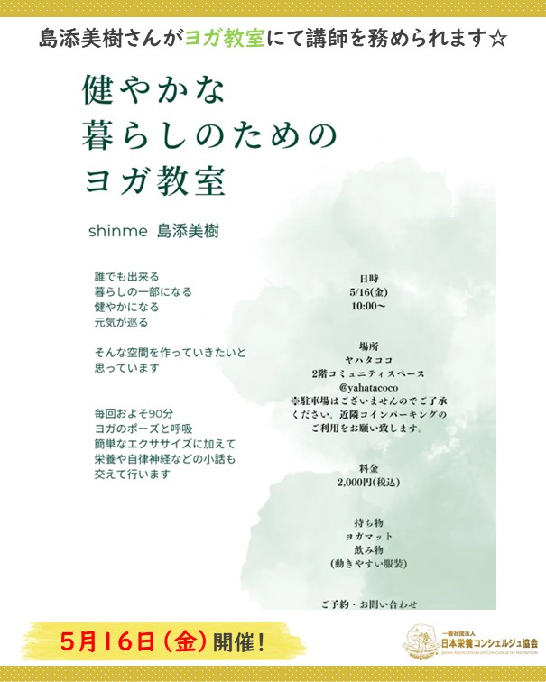 2ッ星栄養コンシェルジュでヨガ講師の島添美樹さんが5月16日(金)に福岡にて開催される、『健やかな暮らしのためのヨガ教室』にて講師を務められます☆