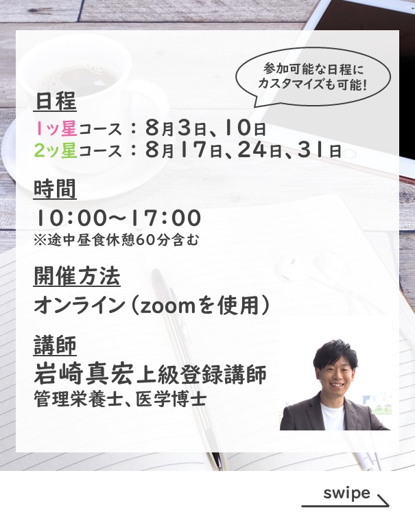 日程をカスタマイズして、実地やオンラインを組み合わせて受講することも可能です☆(お申し込み後の変更もOK)