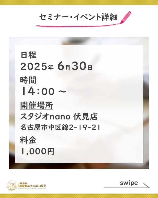 2ッ星栄養コンシェルジュでトレーナーの酒井光里さんが6月30日(月)に名古屋にて行われるワークショップ、『痩せやすい身体を目指すコツ』にて講師を務められます☆