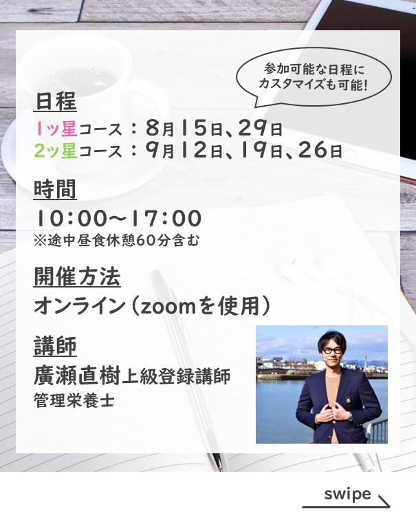 【1ッ星コース&2ッ星セットコース】第1日目: 8月15日(金)、第2日目: 8月29日(金)、第3日目: 9月12日(金)、第4日目: 9月19日(金)、第5日目: 9月26日(金)