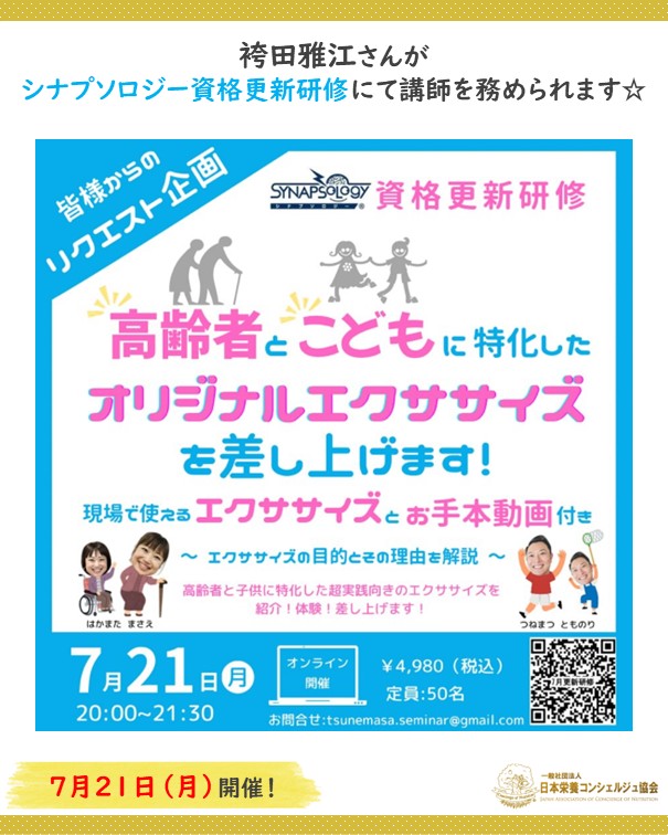 2ッ星栄養コンシェルジュでフィットネスインストラクターの袴田雅江さんが7月21日(月)にシナプソロジー資格更新研修、『高齢者とこどもに特化したオリジナルエクササイズ』にて講師を務められます☆