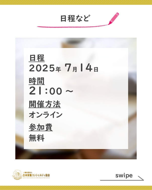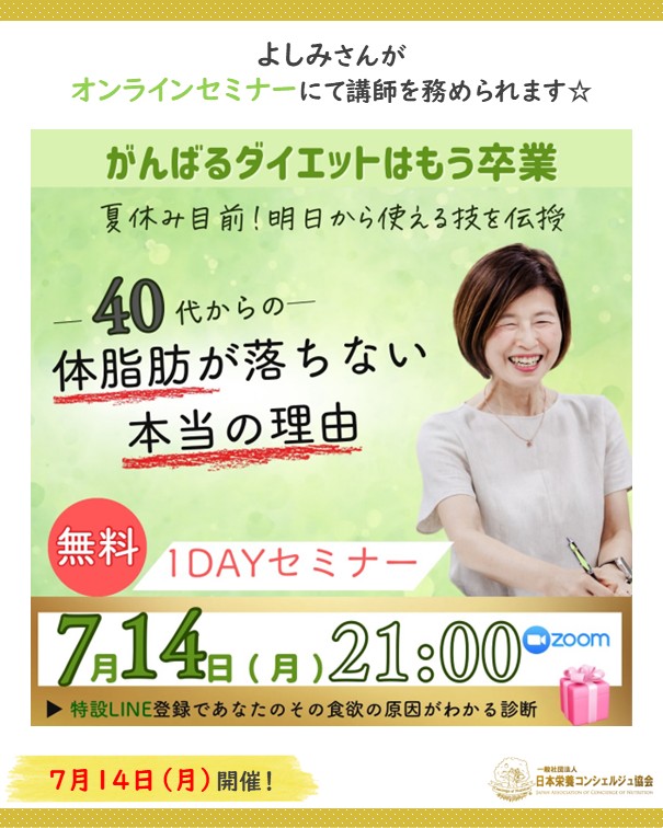2ッ星栄養コンシェルジュのよしみさんが7月14日(月)にオンラインセミナー、『40代からの体脂肪が落ちない本当の理由』にて講師を務められます☆