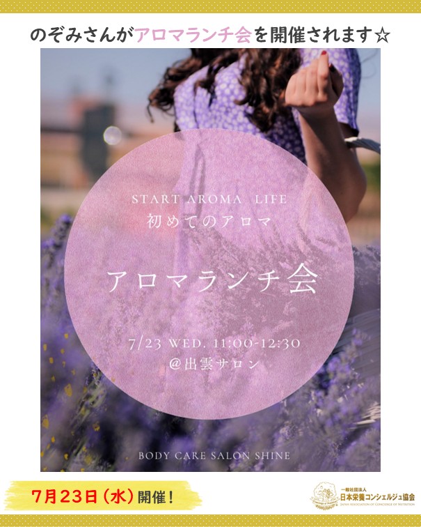 2ッ星栄養コンシェルジュでボディマインドコーチでもあるのぞみさんが7月23日(水)に島根にて、『アロマランチ会』を開催されます☆
