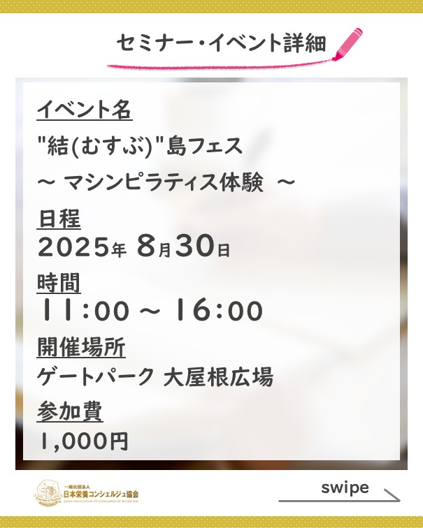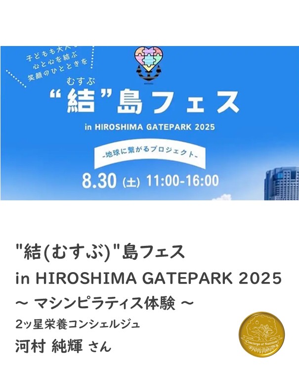 2ッ星栄養コンシェルジュで理学療法士・ピラティスインストラクターの河村純輝さんが8月30日(土)に広島にて行われる、『"結(むすぶ)"島フェスin HIROSHIMA GATEPARK 2025』にてマシンピラティス体験ブースの出店をされます☆