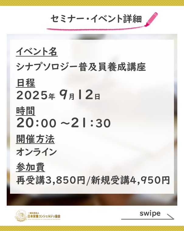 1ッ星栄養コンシェルジュでインストラクターの伝法久美子さんが9月12日(金)にオンラインにて行われる、『シナプソロジー普及員養成講座』にて講師を務められます☆