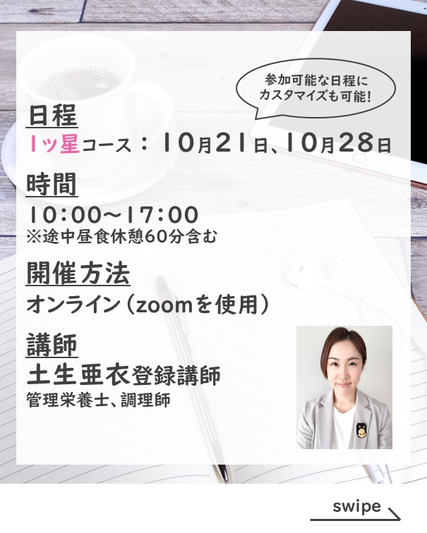 【1ッ星コース】第1日目: 10月21日(火)、第2日目: 10月28日(火)
