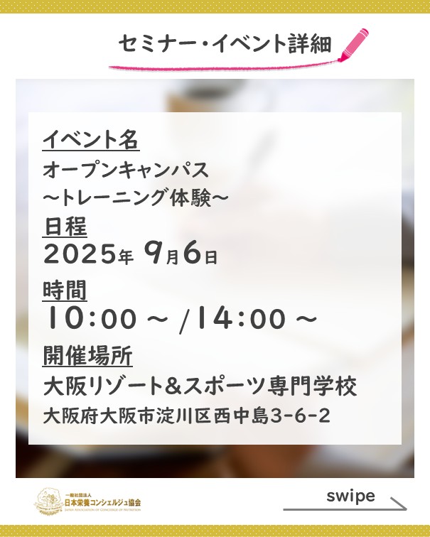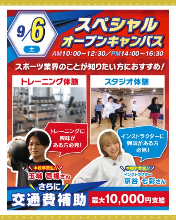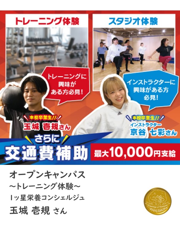 1ッ星栄養コンシェルジュでトレーナーの玉城壱規さんが9月6日(土)に大阪リゾート&スポーツ専門学校にて開催される、オープンキャンパスの『トレーニング体験』にて講師を務められます☆