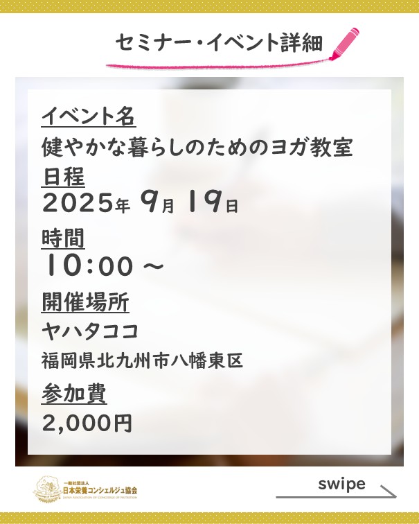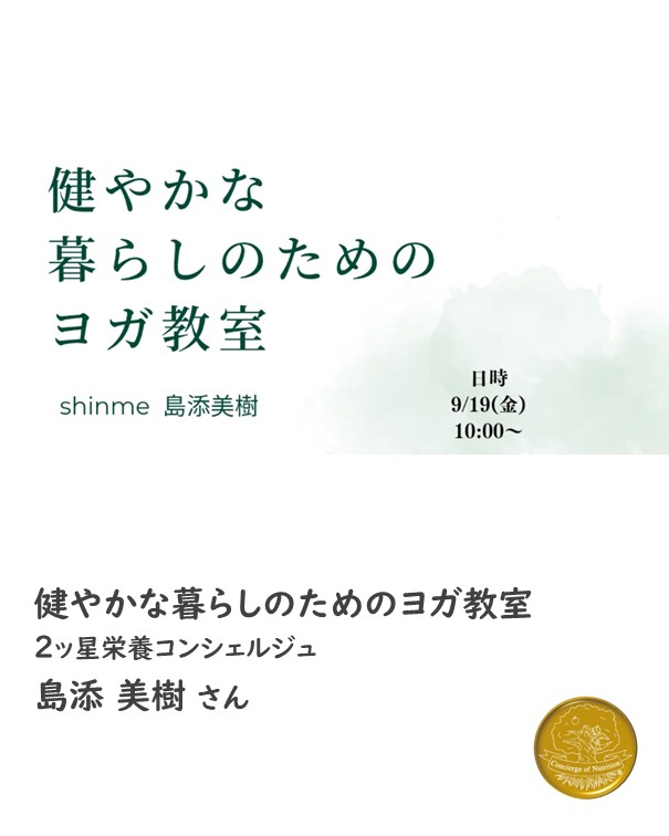 2ッ星栄養コンシェルジュでヨガ講師の島添美樹さんが9月19日(金)に福岡にて開催される、『健やかな暮らしのためのヨガ教室』にて講師を務められます☆