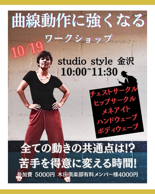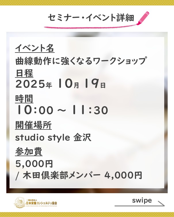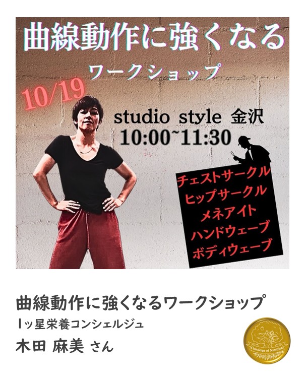 1ッ星栄養コンシェルジュでプロインストラクターの木田麻美さんが10月19日(日)に金沢にて行われるワークショップ、『曲線動作に強くなる』にて講師を務められます☆