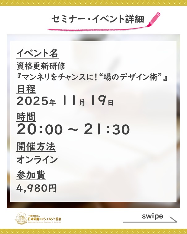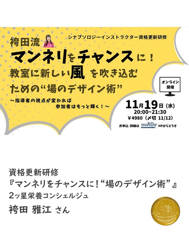 2ッ星栄養コンシェルジュでフィットネスインストラクターの袴田雅江さんが11月19日(水)にオンラインにて開催されるセミナー、『袴田流!マンネリをチャンスに!教室に新しい風を吹き込むための“場のデザイン術”』にて講師を務められます☆