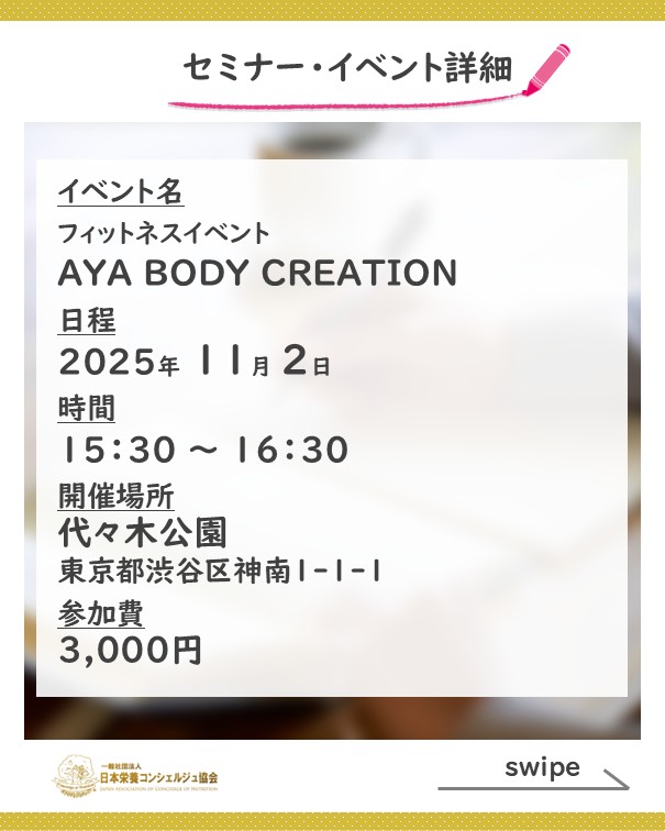 2ッ星栄養コンシェルジュでフィットネスプロデューサーのAYAさんが11月2日(日)に東京にて開催されるフィットネスイベント、『AYA BODY CREATION』に出演されます☆