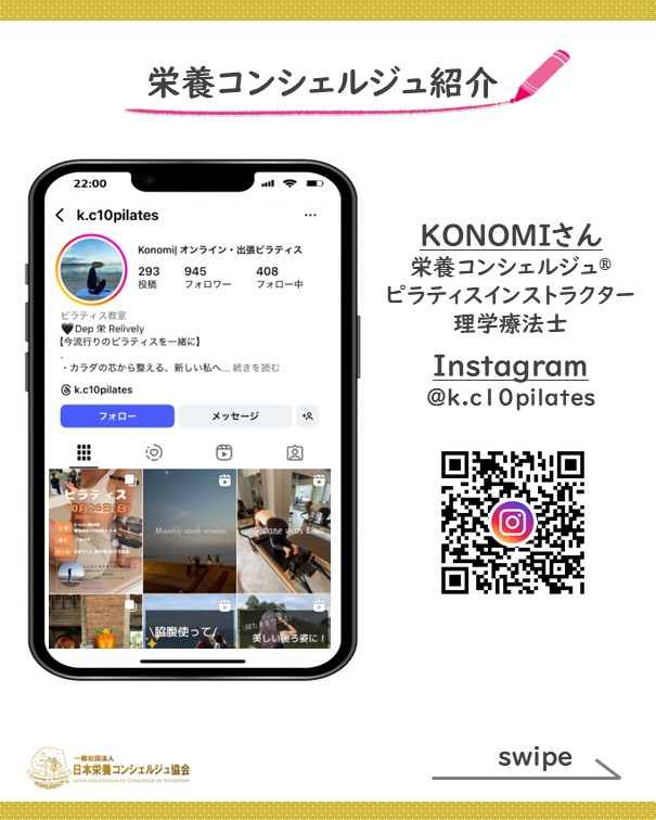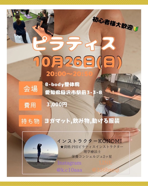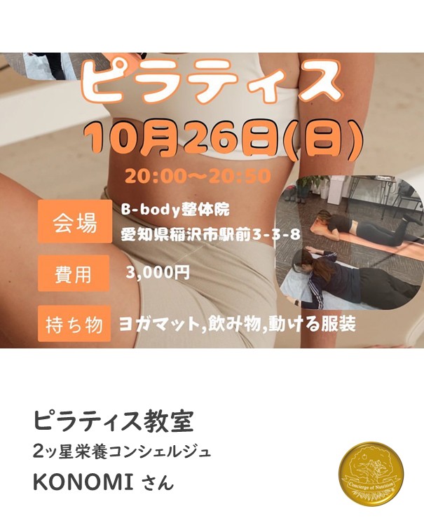 2ッ星栄養コンシェルジュでピラティスインストラクター・理学療法士のKONOMIさんが10月26日(日)に愛知にて開催されるピラティス教室にて講師を務められます☆
