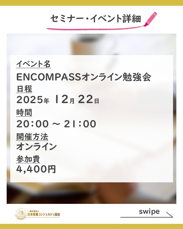 2ッ星栄養コンシェルジュでトレーナーの田中禎子さんが12月22日(月)に『ENCOMPASSオンライン勉強会』にて講師を務められます☆