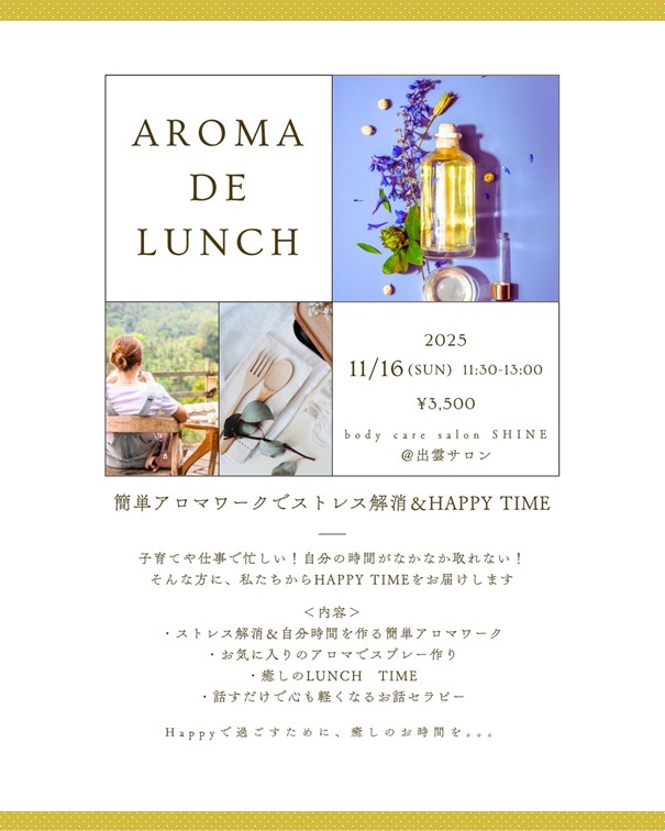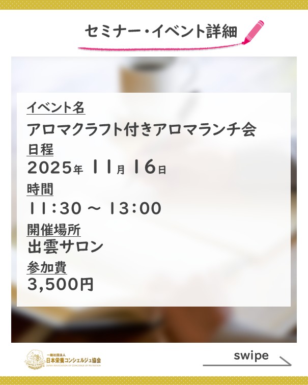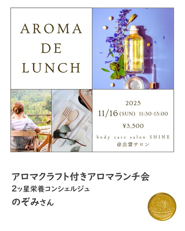 2ッ星栄養コンシェルジュでボディマインドコーチのぞみさんが11月16日(日)に出雲にて、『アロマランチ会』を開催されます☆