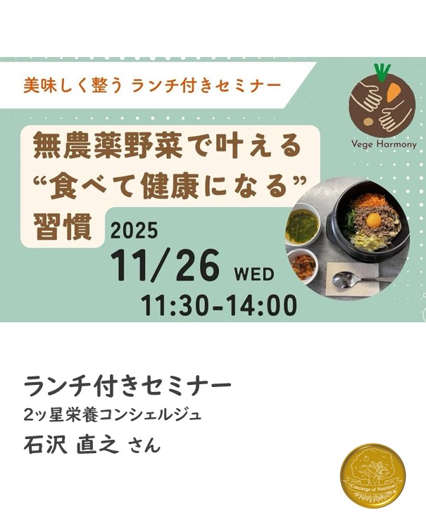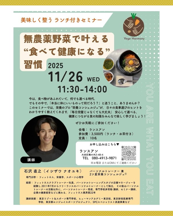 2ッ星栄養コンシェルジュでライフスキルコーチの石沢直之さんが11月26日(水)に東京にて開催されるランチ付きセミナーにて講師を務められます☆