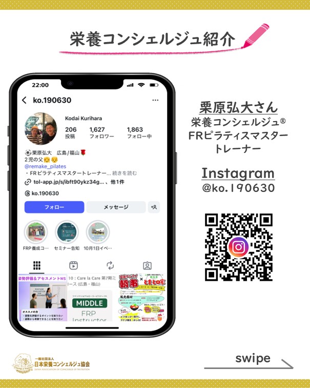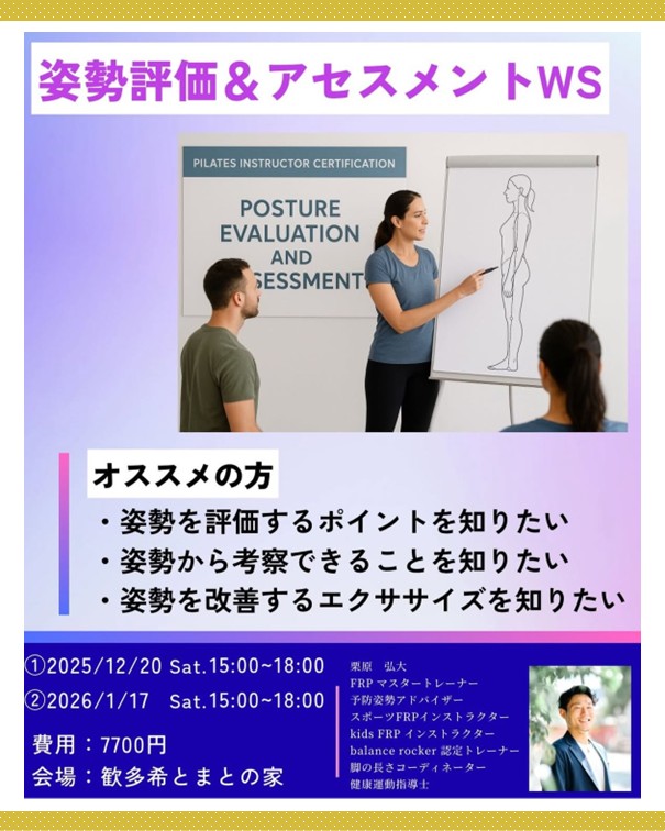 2ッ星栄養コンシェルジュでFRピラティスマスタートレーナーの栗原弘大さんが12月20日(土)、1月17日(土)に広島にて、『姿勢評価とアセスメントについてのワークショップ』にて講師を務められます☆