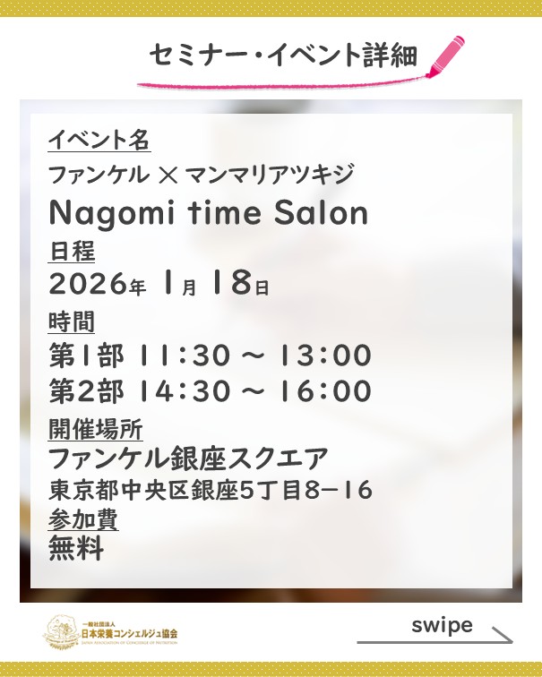 2ッ星栄養コンシェルジュでピラティスインストラクターの辻本あゆみさんが1月18日(日)に東京にて開催される、『Nagomi time Salon』にて運動ブースを担当されます☆