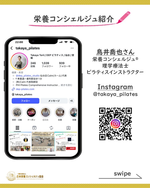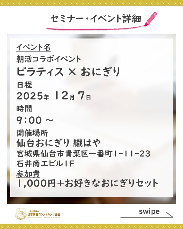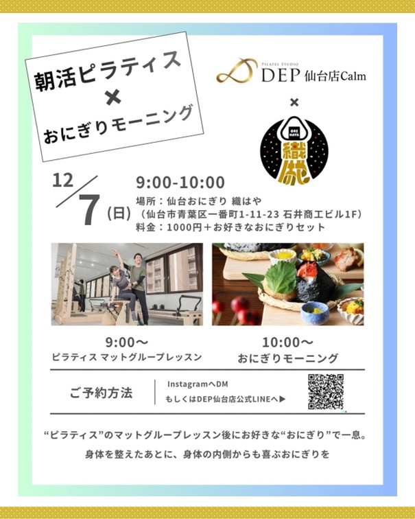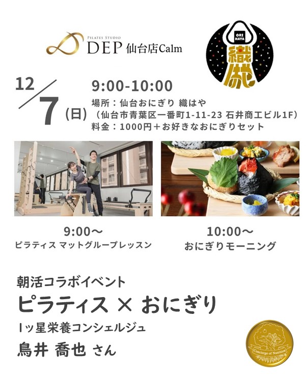 1ッ星栄養コンシェルジュで理学療法士・ピラティスインストラクターの鳥井喬也さんが12月7日(日)に仙台にて朝活コラボイベント、『ピラティス × おにぎり』を開催されます☆