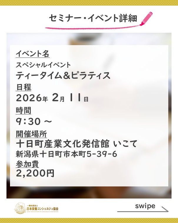 2ッ星栄養コンシェルジュでパーソナルトレーナー・ピラティスインストラクターの丸山響央さんが2月11日(水)に新潟にて開催されるスペシャルイベント、『ティータイム&ピラティス』にて講師を務められます☆