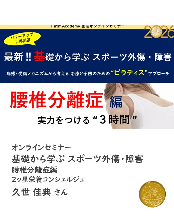 2ッ星栄養コンシェルジュでトレーナー・理学療法士の久世佳典さんが1月7日(水)にオンラインセミナー、『最新!!基礎から学ぶ スポーツ外傷・障害 腰椎分離症編』にて講師を務められます☆